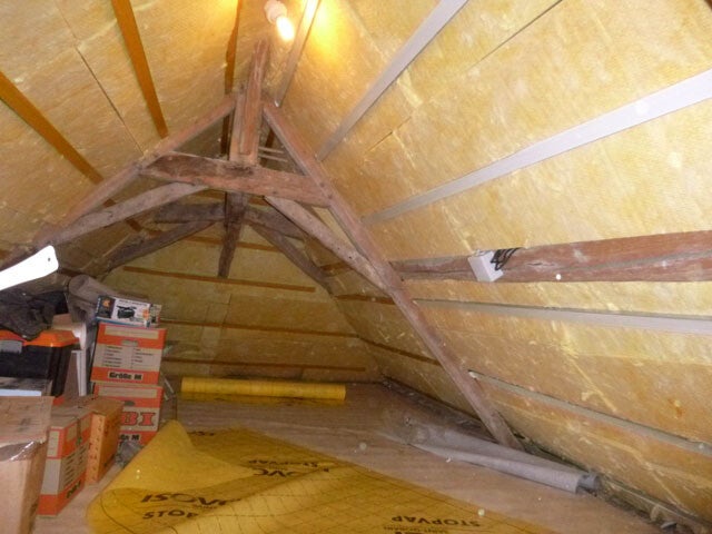 Réalisation d'une isolation thermique des murs et des sous rampants par l'intérieur en laine de verre de 120mm et 260mm, finition bandes double passes.